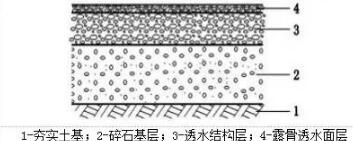 (1)路面結(jié)構(gòu):露骨透水混凝土路面自下而上主要由夯實(shí)土基、碎石基層、透水結(jié)構(gòu)層、露骨透水面層四個(gè)部分組成,如圖1。