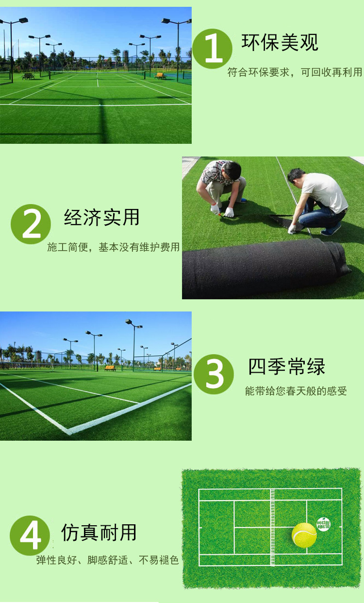 網(wǎng)球場(chǎng)人造草坪主要適用于:籃球場(chǎng)、網(wǎng)球場(chǎng)、門球場(chǎng)、幼兒園人造草坪、果嶺草等