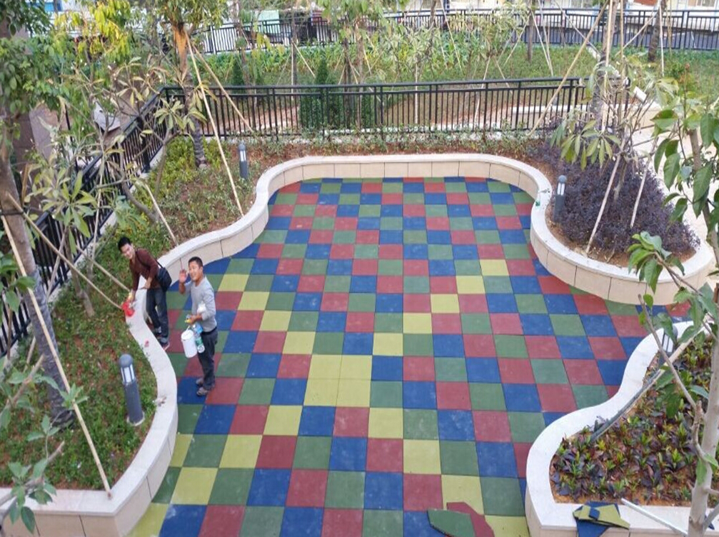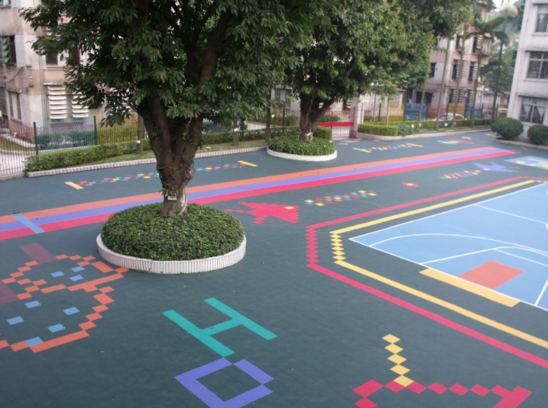 采用原色橡膠顆粒,顏色鮮艷,色彩豐富可組成各種卡通圖案,不易褪色。其透心特質(zhì),即表面磨損仍光滑如新。因整體鋪設(shè),故不存在裂縫問(wèn)題。其下面吸震層可根據(jù)地面狀況作適當(dāng)調(diào)整,使其表面平整。