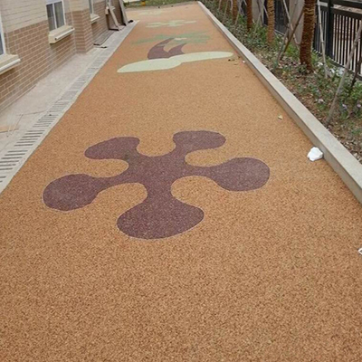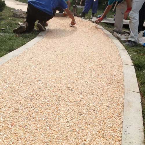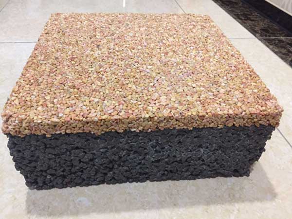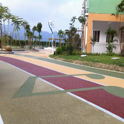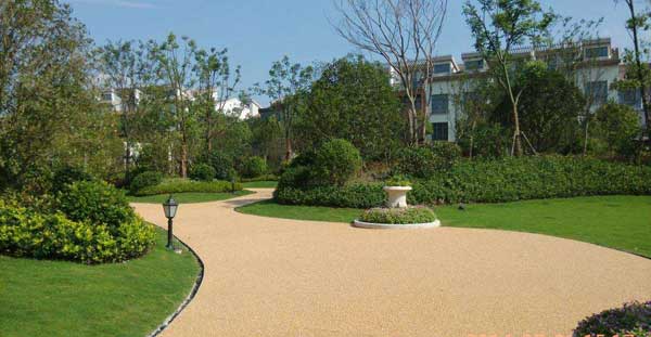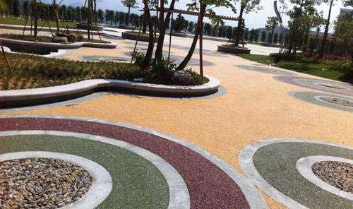 傳統(tǒng)的透水混凝土是由水泥、石子、膠結劑組成的材料,主要目的是能夠達到透氣透水的效果,較多應用于人行道和園林綠道,由于傳統(tǒng)的透水混凝土最終仍然和水泥路面一樣的灰色,所以不能滿足對審美需求較高的人群,即使能夠對透水混凝土進行染色,但染色畢竟不能夠持久鮮艷,因此業(yè)內人士研究了膠粘石透水地坪。直接使用透明的有機樹脂(膠結劑)把通過人工篩選的精美天然石子粘結起來鋪裝在地面上。由于膠結劑是透明的,所以形成的膠粘石地面就像把石子隨意自然的攤鋪在地上一樣,粒粒清晰可見,而又不會因受到壓力或摩擦而松散,更不會掉色,雨水通過膠粘石地面時也能清楚的看清水是如何被“吸”到地下。