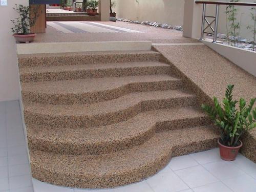 一般分為兩種做法,室外需要較高承載力要求的場地,先鋪裝足夠承載厚度的普通透水混凝土,再鋪裝1-3CM的膠粘石,這樣的做法不僅保證了足夠的承載力,同時使表面美觀自然,更重要的是大大的節(jié)約了成本,因為天然的石子是非常昂貴的。而室內或其他用于裝飾對承載要求不高的可直接鋪裝1-3CM的膠粘石,如游泳池旁、洗浴中心等,不僅裝飾了地面,同時時地面永無積水,大大的降低了滑倒事件的發(fā)生。