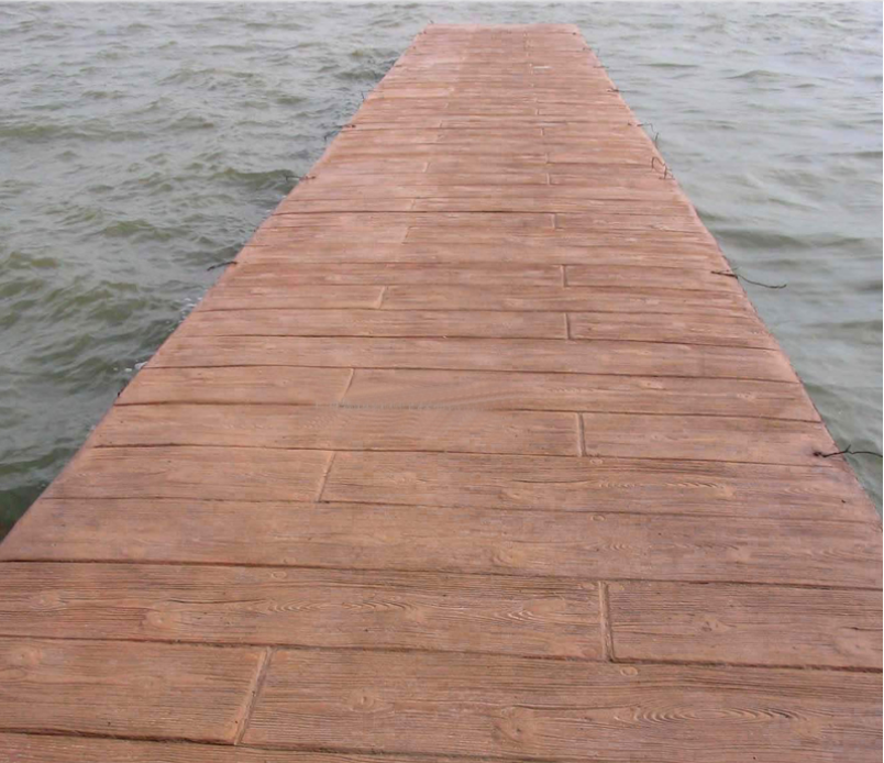 仿木壓模地坪是通過(guò)使用強(qiáng)化料和顏料經(jīng)過(guò)特殊工藝處理后,滲入普通混凝土中改變其性質(zhì)與顏色,再使用脫膜粉和模具在未干的混凝土面層上壓印紋理圖案,最后使用清洗表層、噴涂保護(hù)劑等工藝,在其表面上創(chuàng)造出仿真度極高的自然木質(zhì)效果。